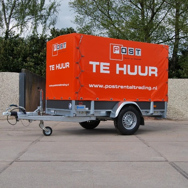 Enkelassige aanhangwagen met huif, geschikt voor het droog vervoeren van uw goederen. Door de grote ruimte is de aanhanger met huif makkelijk te gebruiken voor bijvoorbeeld verhuizingen. Door het lage eigen gewicht kunt u nog 500 kg aan spullen transporteren en dit allemaal alleen met een B-rijbewijs.