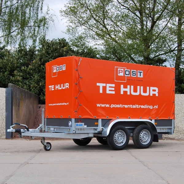 2 Assige aanhangwagen met huif, de grootste en meest makkelijke aanhanger voor verhuizgingen of het droog vervoeren van andere goederen. Met een laad capaciteit van 1566 kg kunt u een grote en zware lading in één keertransporteren.