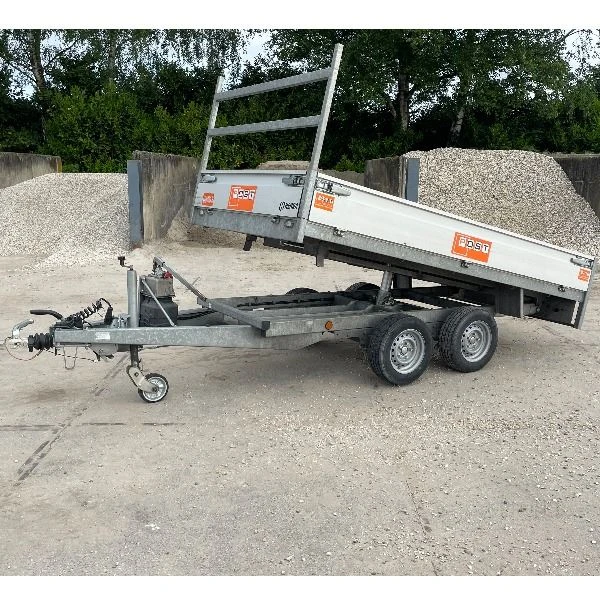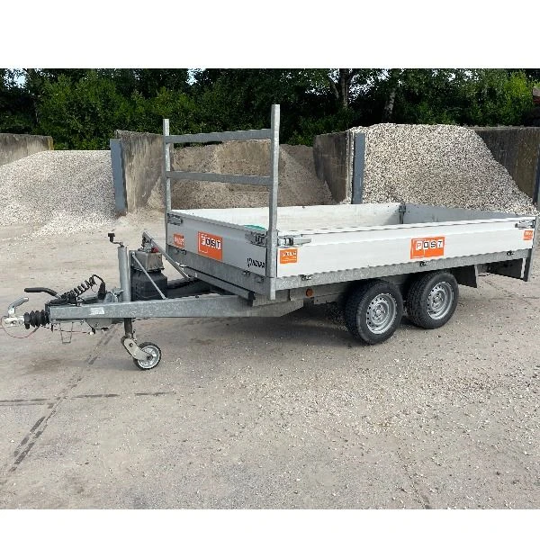 Kipper aanhanger, voorzien van een kiepsysteem. Met deze aanhangwagen kunt u achterwaarts kippen, ideaal op een werkterrein met beperkte ruimte. Bij deze kipperaanhanger zijn tevens loofrekken te huur voor het transporteren van groenafval. Deze loofrekken beschikken elk over een scharnierzijde. Een afdeknet kan tegen meerprijs erbij geleverd worden voor het veilig transporteren van de lading. Deze kunt u selecteren bij de opties van dit product.