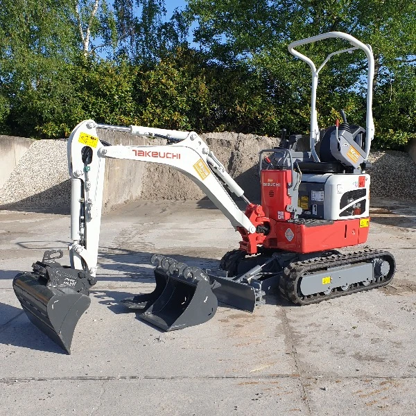 De minigraver 1.000 kg Takeuchi TB210R is een ideale minigraver voor in de kleine ruimtes. Door zijn compacte afmetingen, maar toch voorzien van joystick besturing, is het heel eenvoudig met deze minigraver te draaien. Voorzien van hydraulisch snelwissel en standaard uitgerust met een brede bak, dieplepel bak en sleuvenbak kunt u snel van graafbak wisselen zonder van de machine af te hoeven. Door de inklapbare beugel kunt u snel onder een lage doorgang door. De minigraver is makkelijk toegangelijk van beide kanten door dat beide armsteunen omhoog kunnen. De breedte van de onderwagen is aan te passen van in de breedste stand 1.02 m naar 0.75 m. Dit is eenvoudig te doen door alleen maar 1 hendel te bedienen.