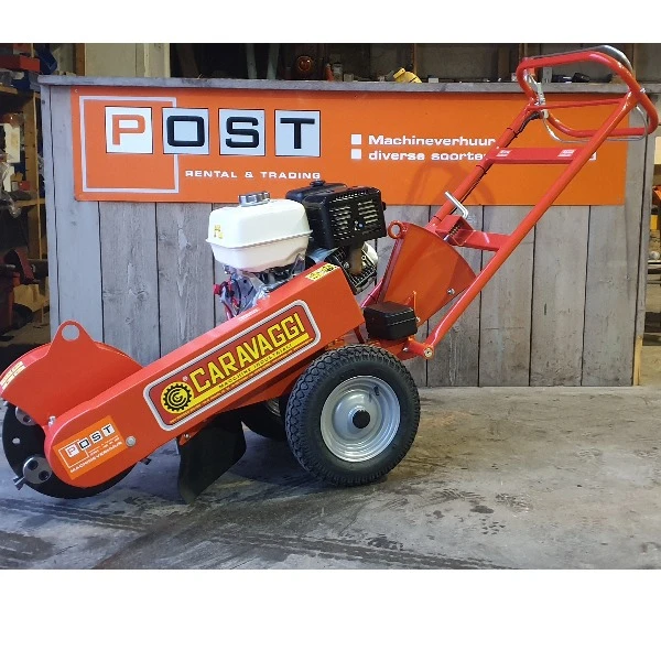 De freesschijf wordt aangedreven door een centrifugaalkoppeling. Met de Honda OHV motor van 13 pk is er genoeg kracht om de stobbe stuk te maken. De snijrotor heef hardstalen beitels van "Widia". De duwbouw (handvat) is te verstellen in verschillende hoogte, om een goede werkhouding aan te nemen.
